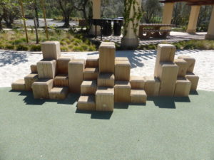 The playground has two sand areas, each with diggers. The play structures are made of wood, so they blend in nicely with the surrounding hills and don’t stand out like the brightly colored structures found at many other parks. There are two sets of climbing blocks with varying heights.